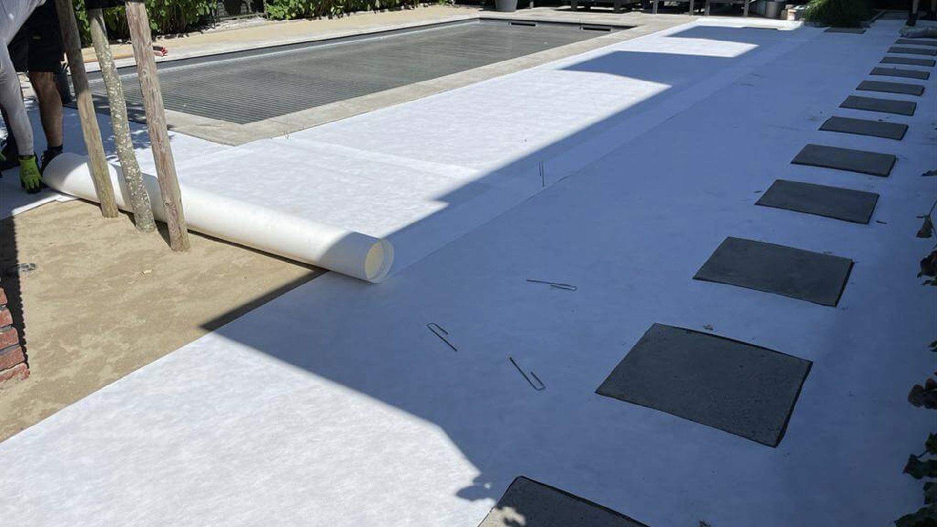 - Je wil niet dat er tijdens het leggen van het kunstgras voetstappen in het geëgaliseerde zandbed komen. Een drukverdelend doek beschermt hier tegen.